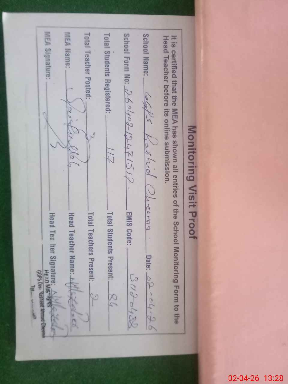 | Attendance Register | Head Teacher | MEA with School | Visit Proof |