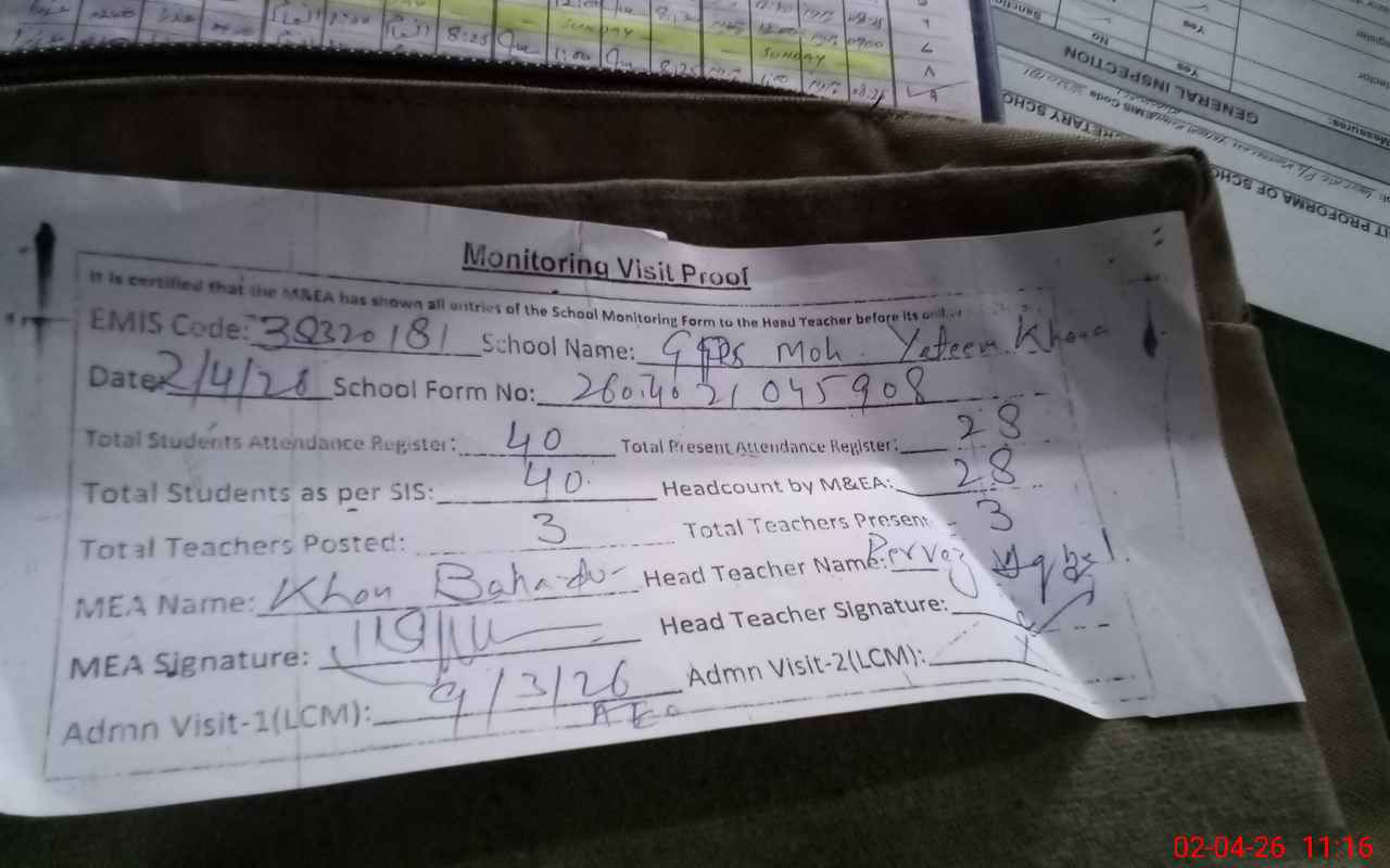| Attendance Register | Head Teacher | MEA with School | Visit Proof |