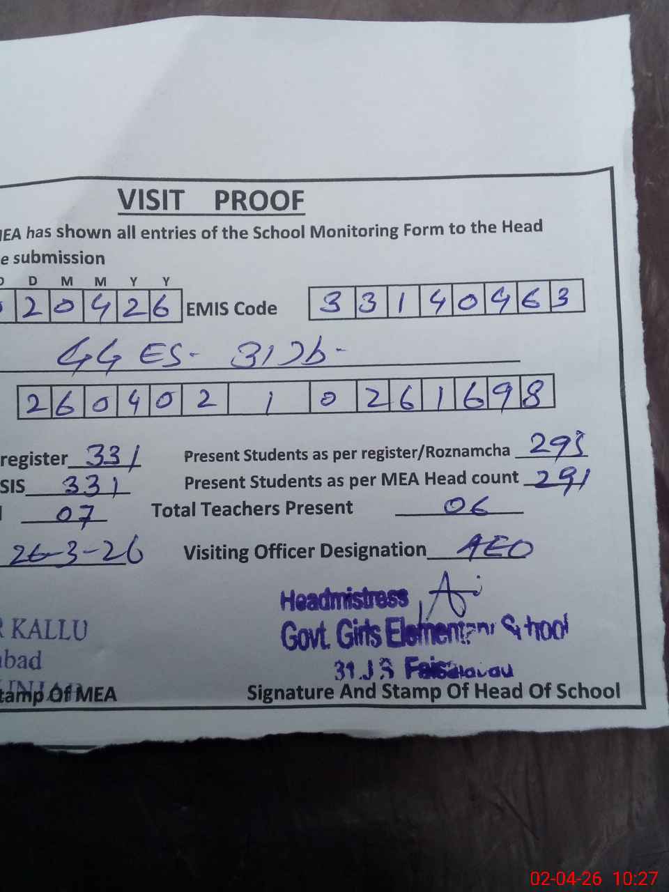 | EMIS Code: 33140463 | Name of School: GGES CHAK NO 31 JB | |||