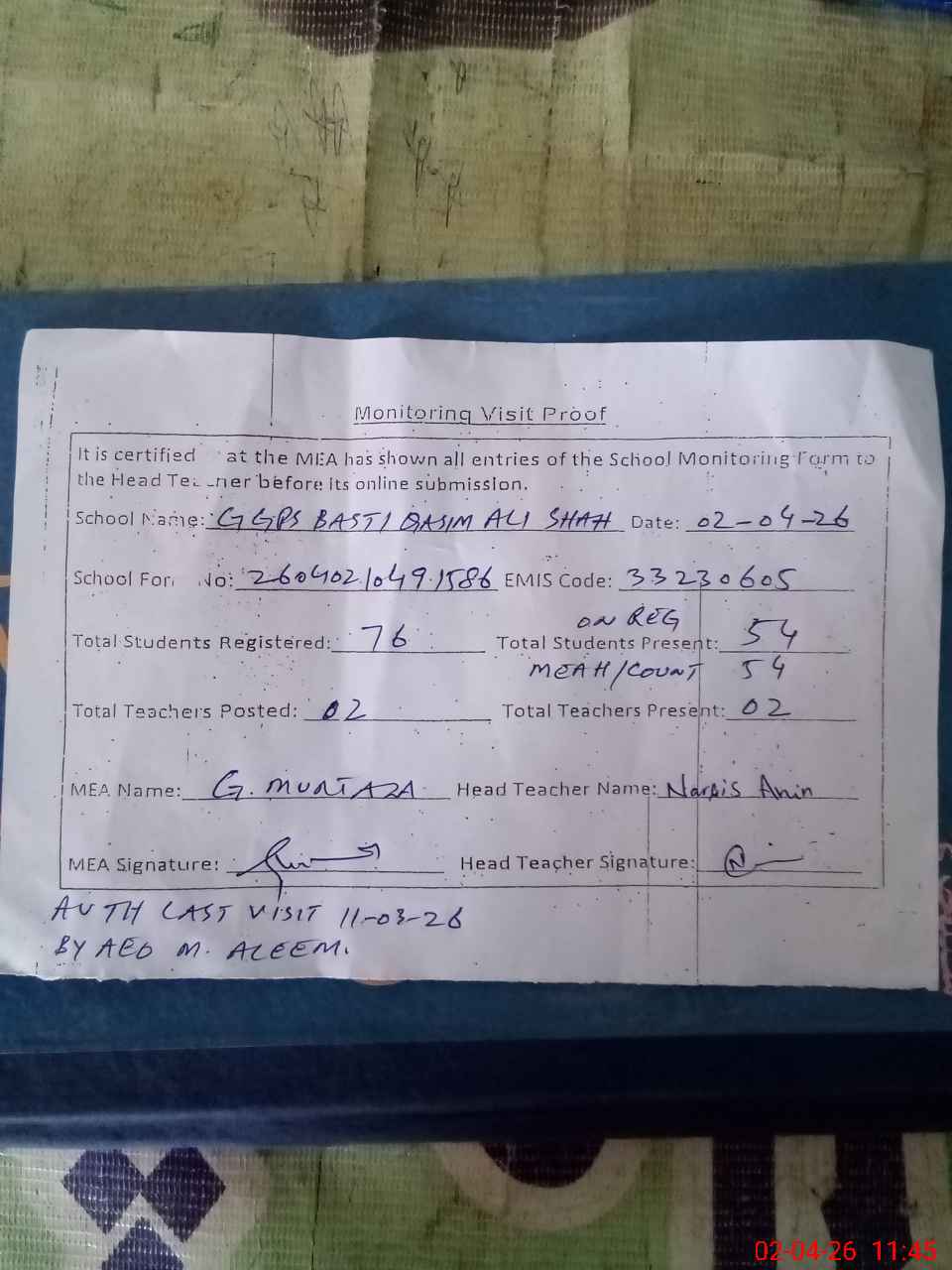 | Attendance Register | Head Teacher | MEA with School | Visit Proof |