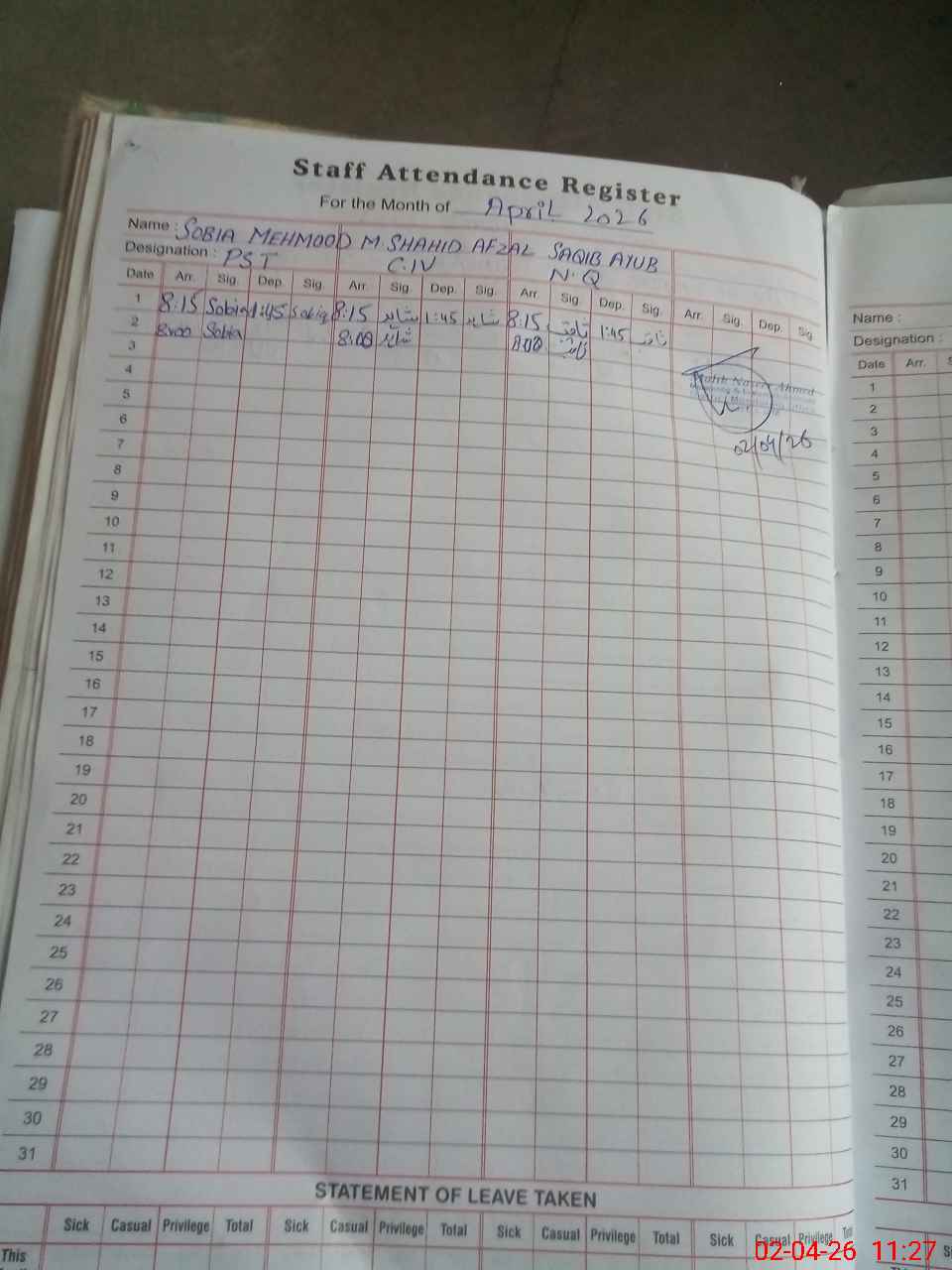 | Leave | Duty | Absent | Maternity | Medical | Ex- Pak |