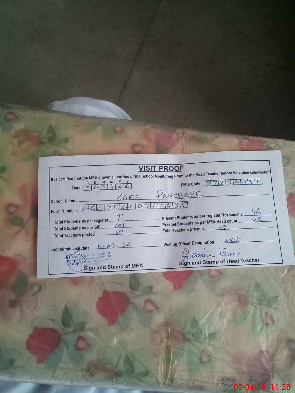 | Attendance Register | Head Teacher | MEA with School | Visit Proof |