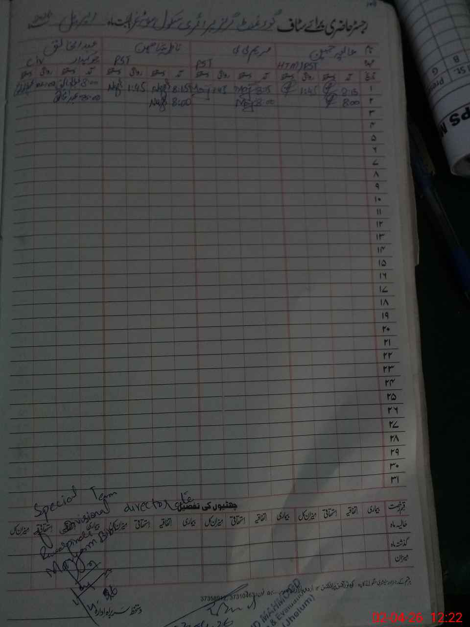 | CNIC | Full Name | Designation | R/C | Absence During Last Calender Month |