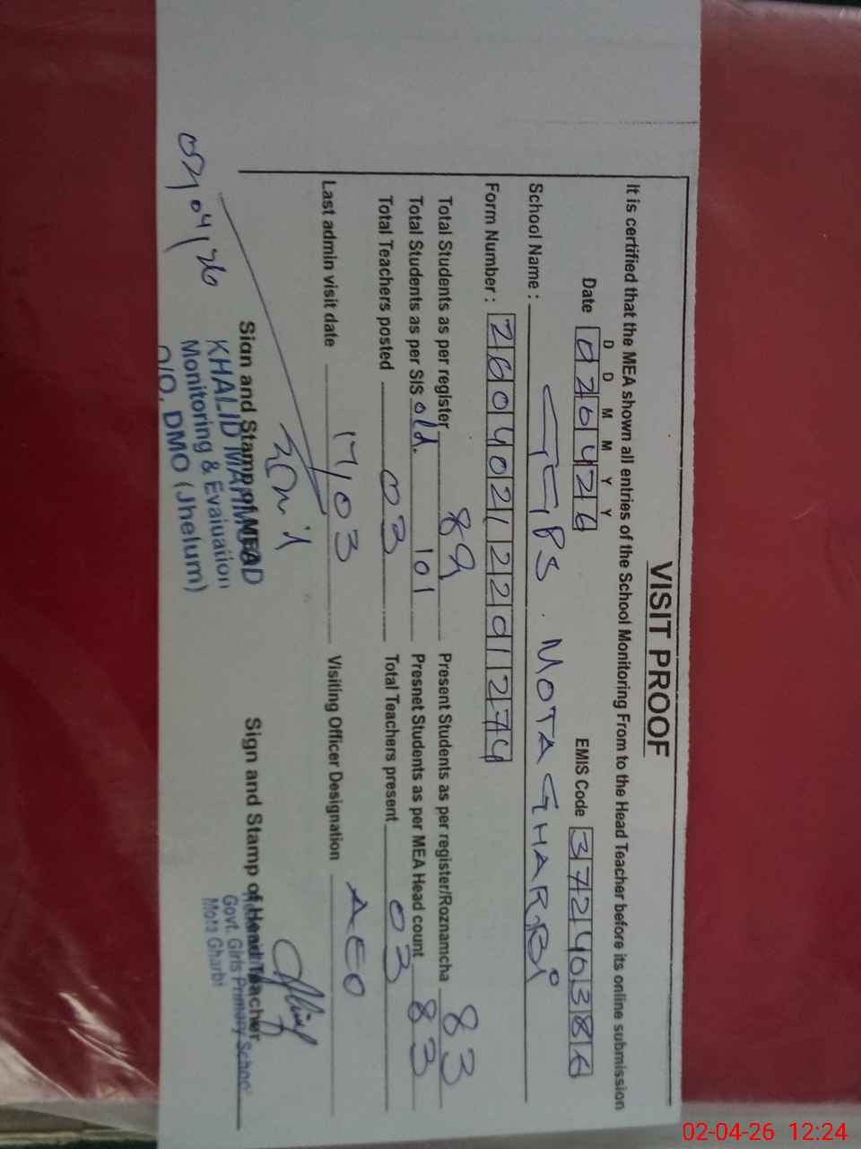 | Certified that this School was Inspected by the Undersigned MEA/DMO Today and the Information Stated Above is as Per Record. | |||||