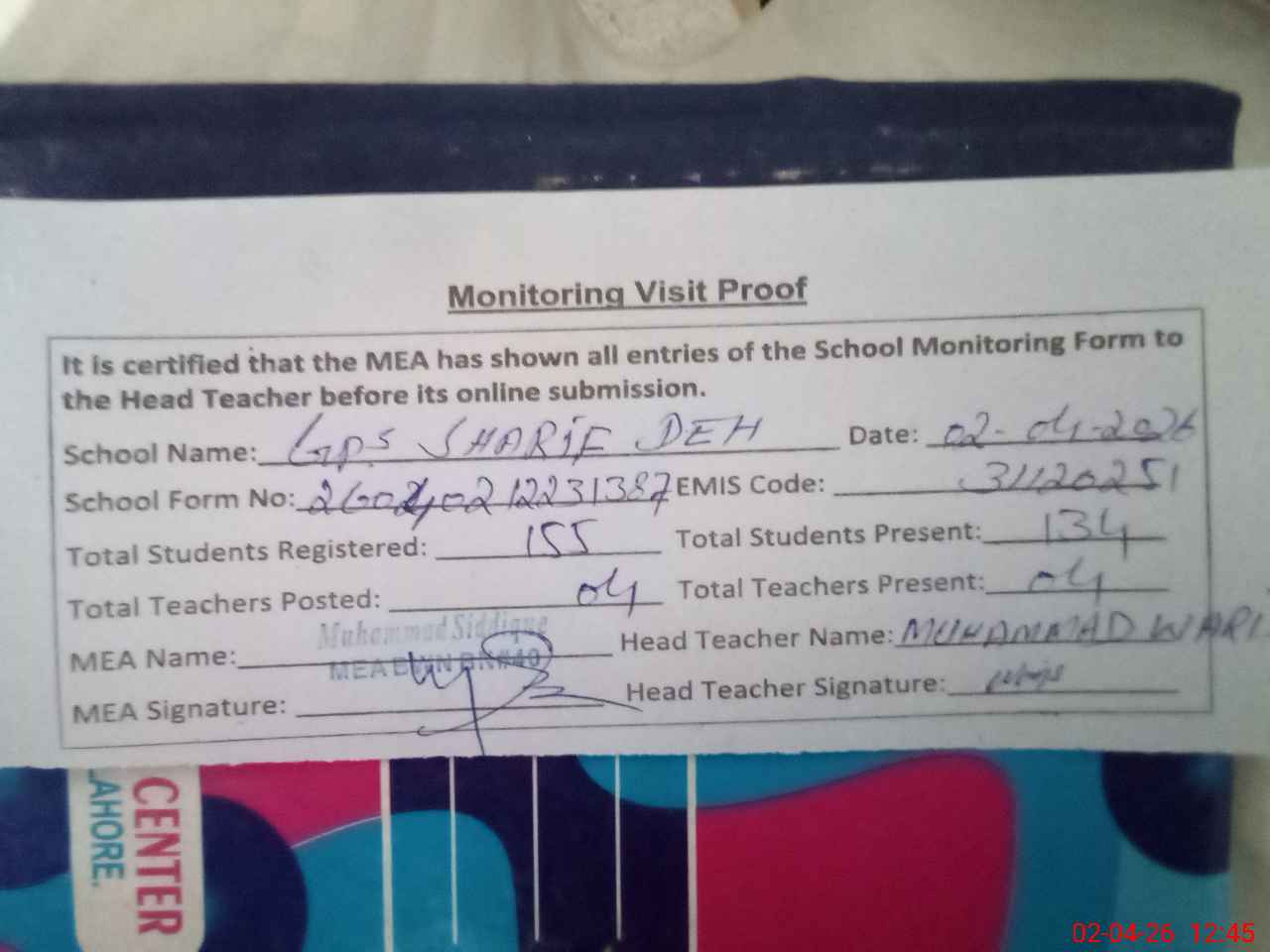 | Attendance Register | Head Teacher | MEA with School | Visit Proof |