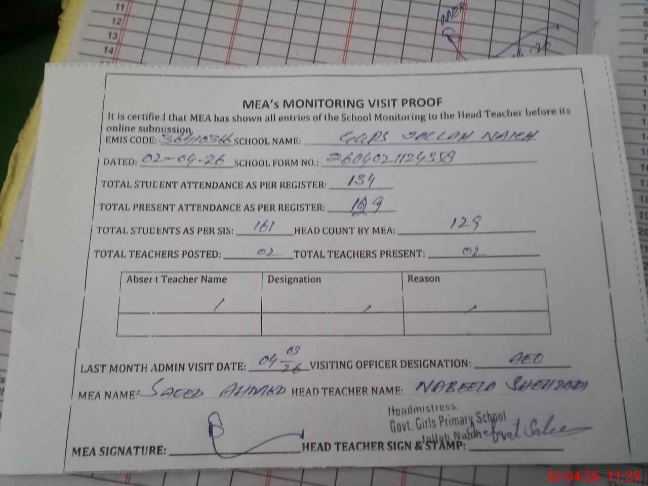 | Attendance Register | Head Teacher | MEA with School | Visit Proof |