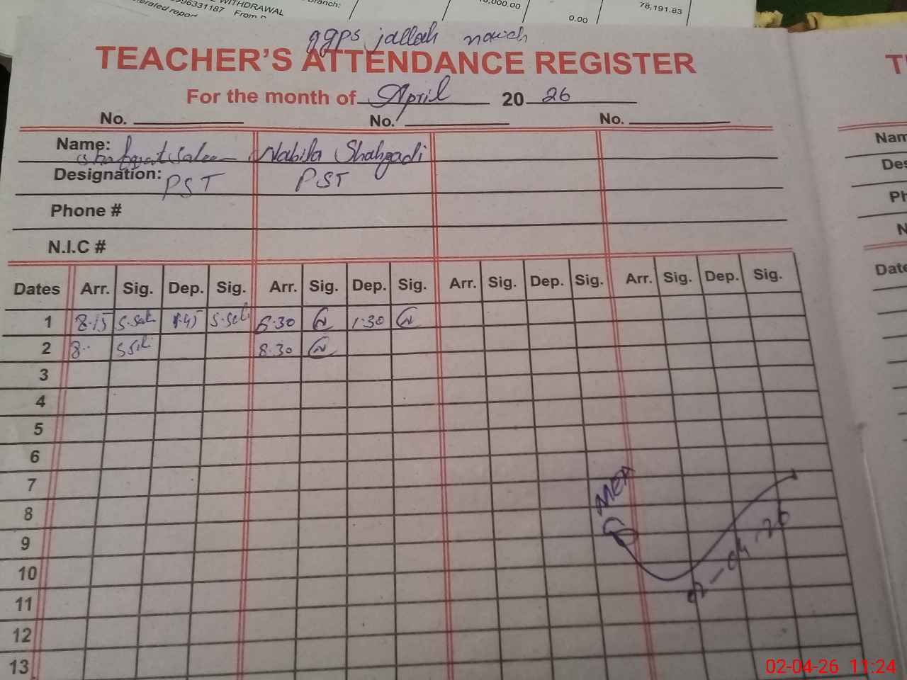 | Name: SH**** SA**** Designation: (School Headmaster's/Headmistress's) PST Phone/Cell Number: 03**** |