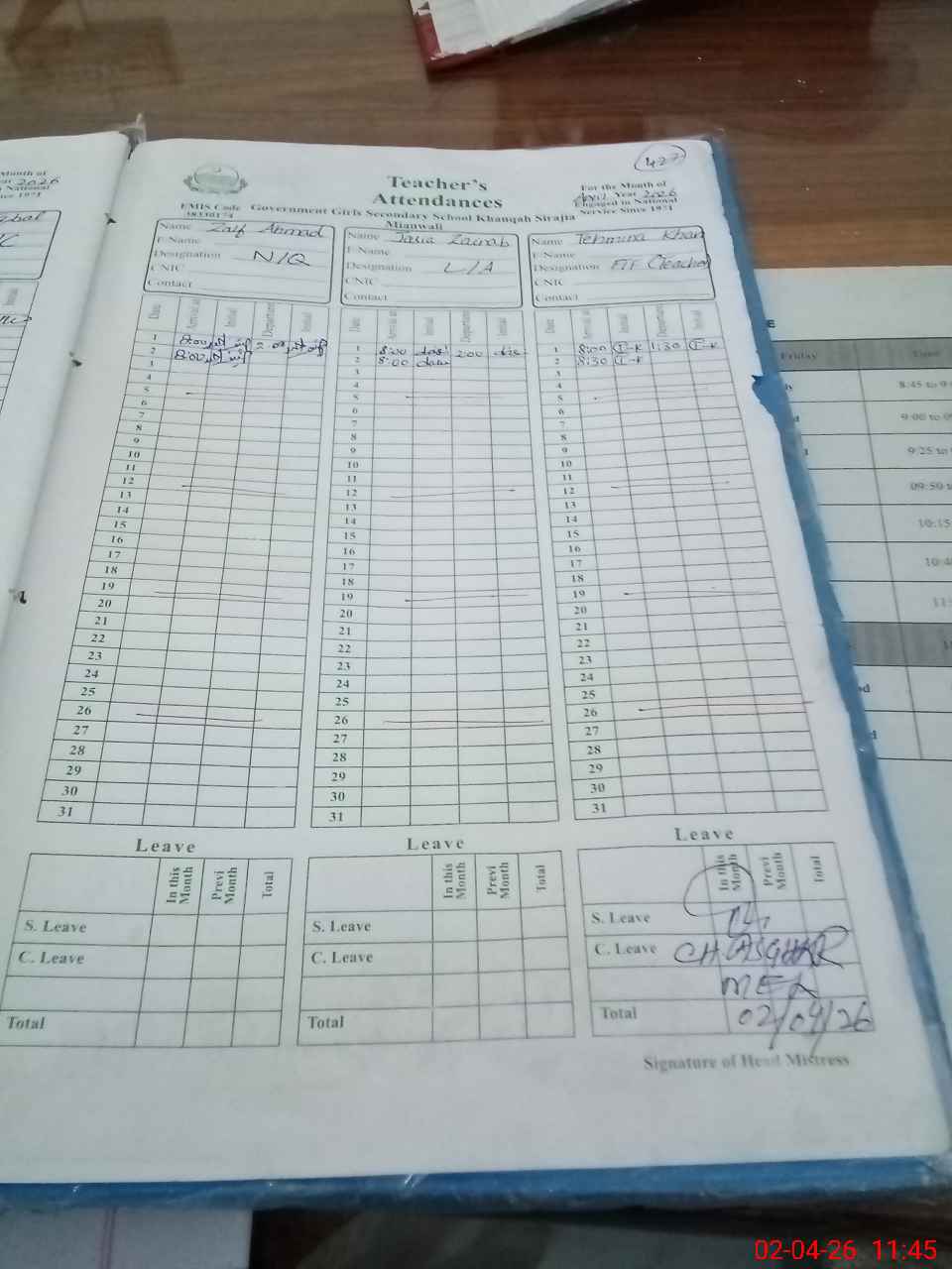 | CNIC | Full Name | Designation | R/C | Absence During Last Calender Month |