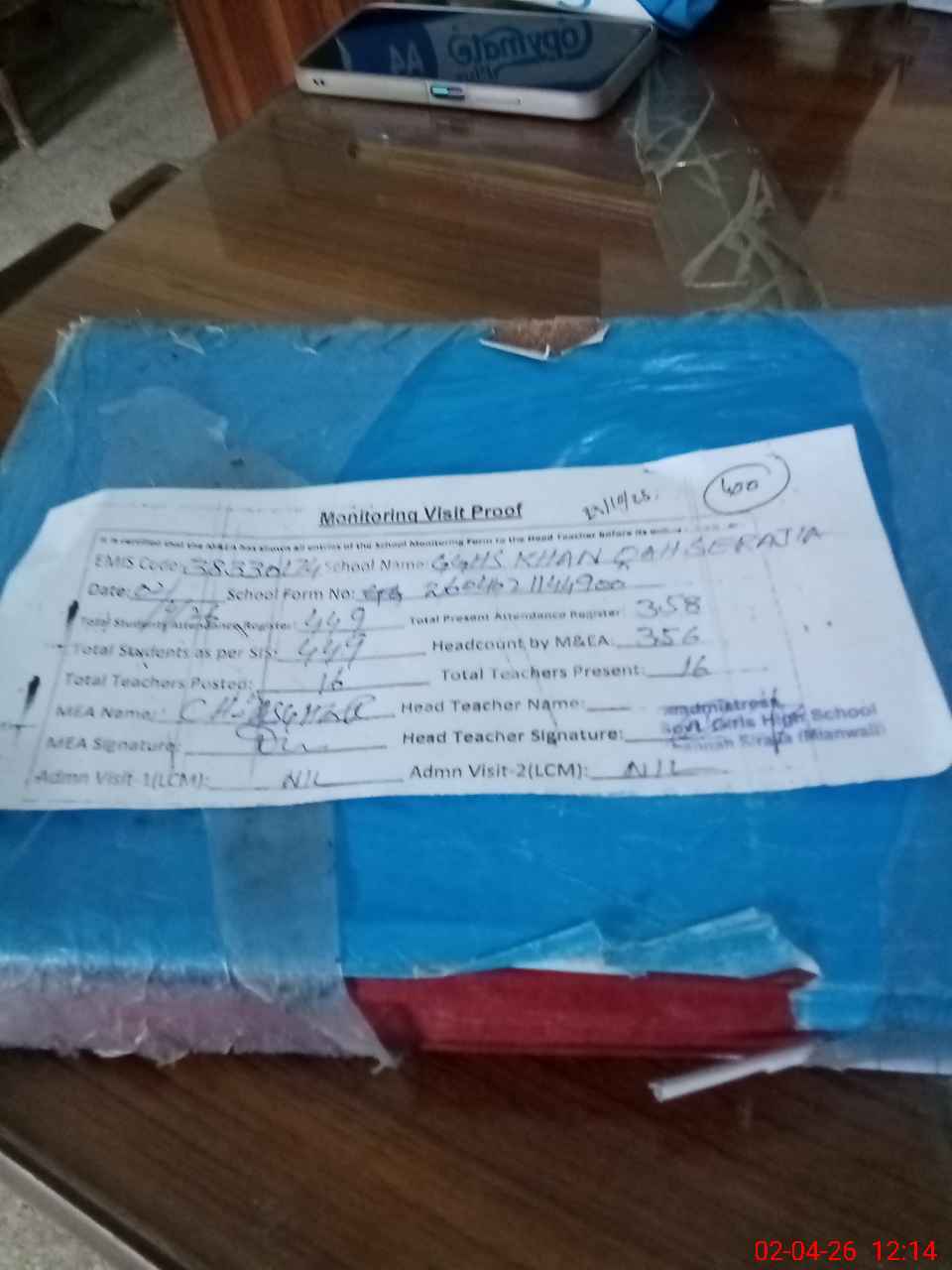 | Attendance Register | Head Teacher | MEA with School | Visit Proof |
