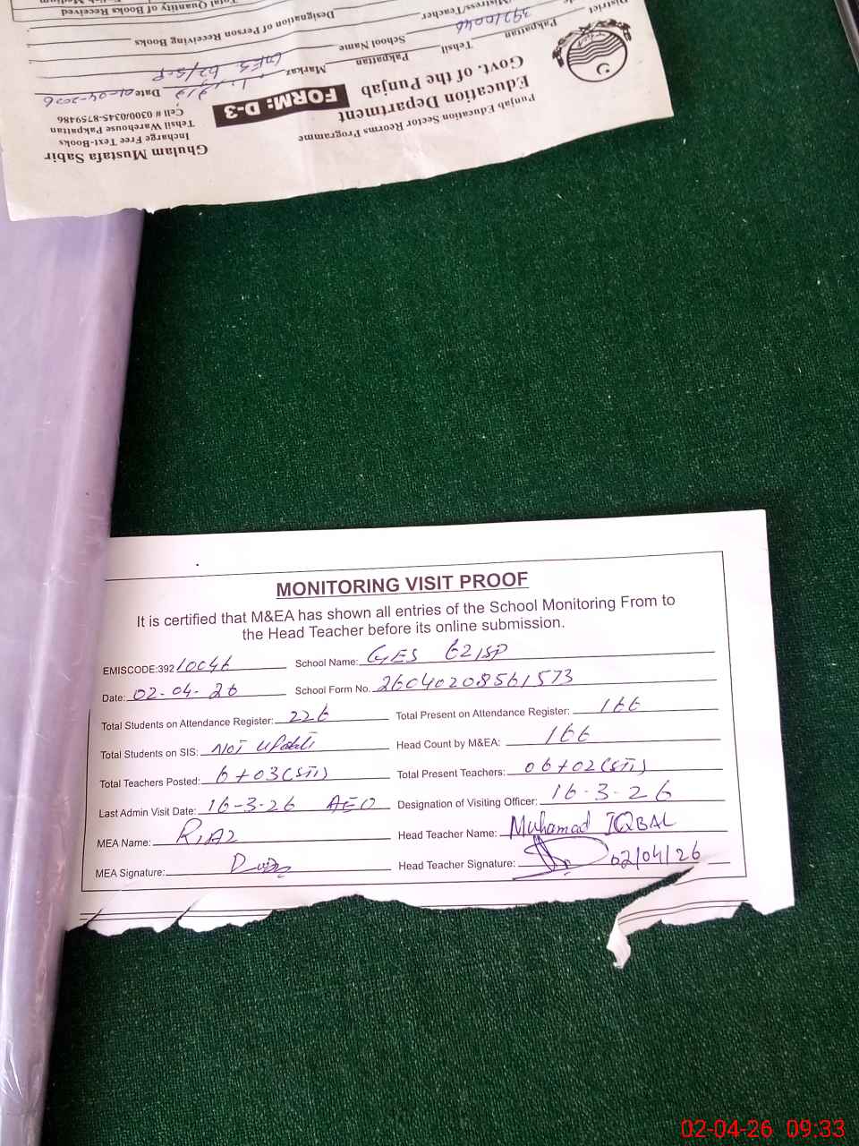 | Attendance Register | Head Teacher | MEA with School | Visit Proof |
