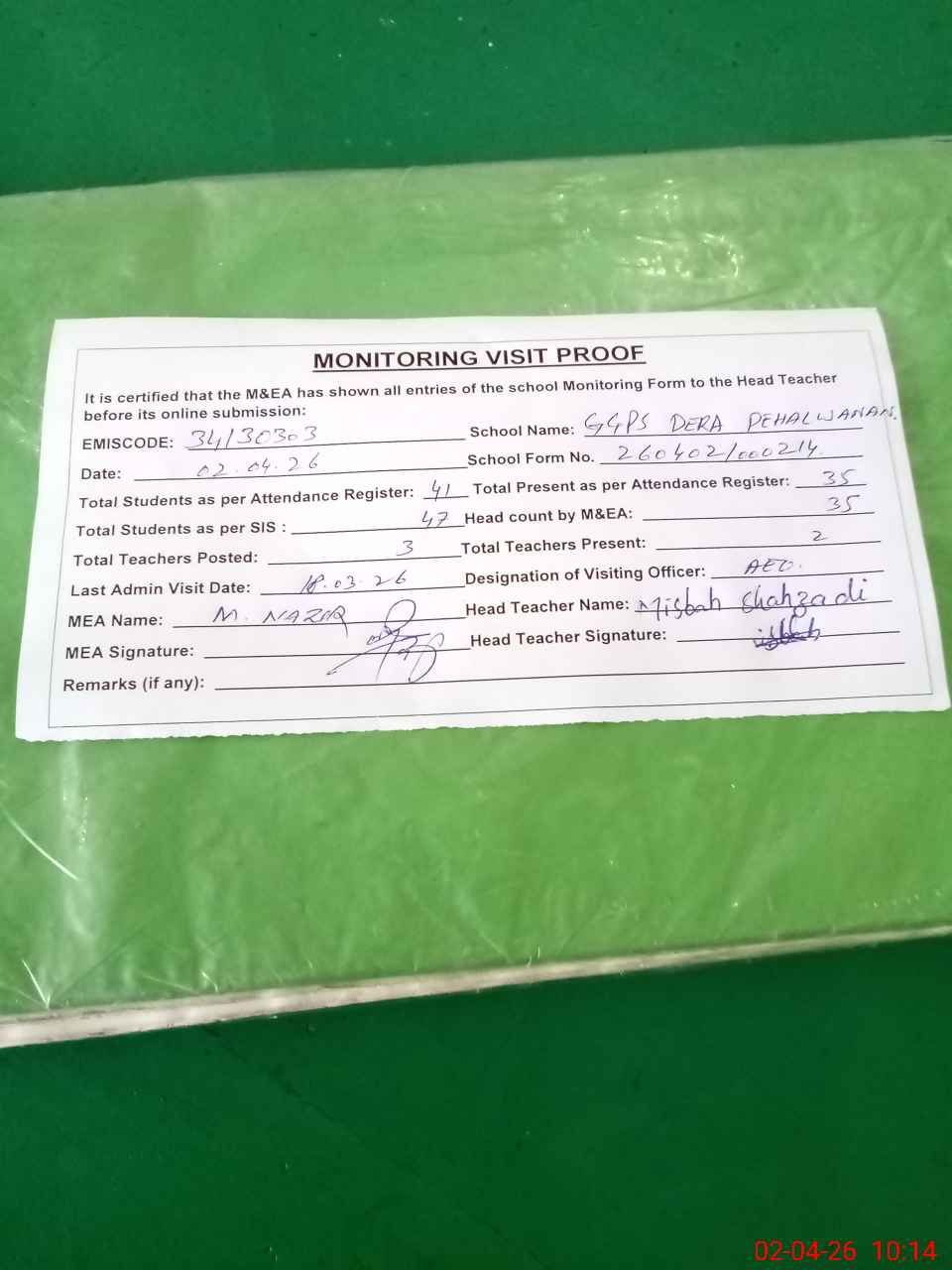 | Attendance Register | Head Teacher | MEA with School | Visit Proof |