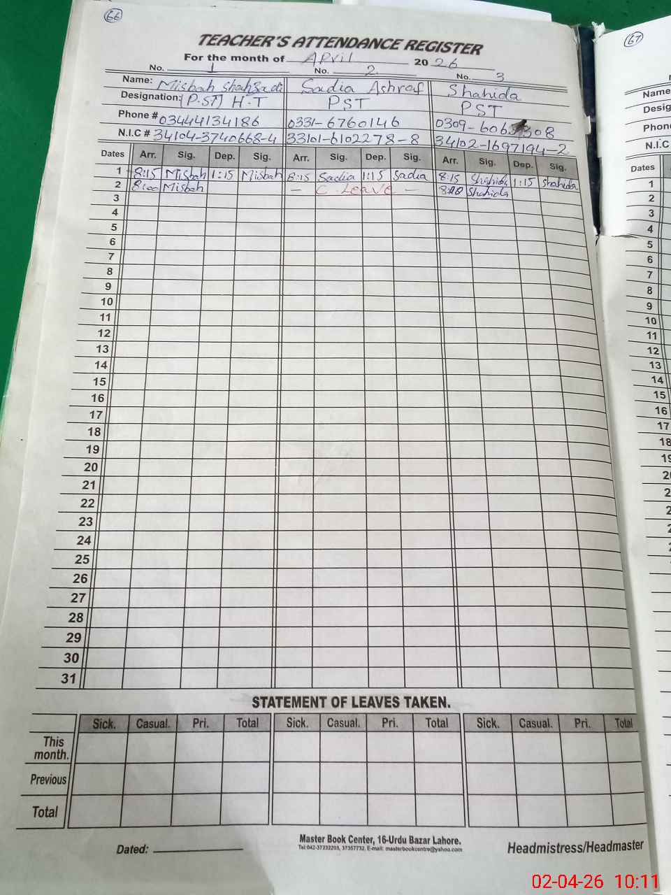 | CNIC | Full Name | Designation | R/C | Absence During Last Calender Month |