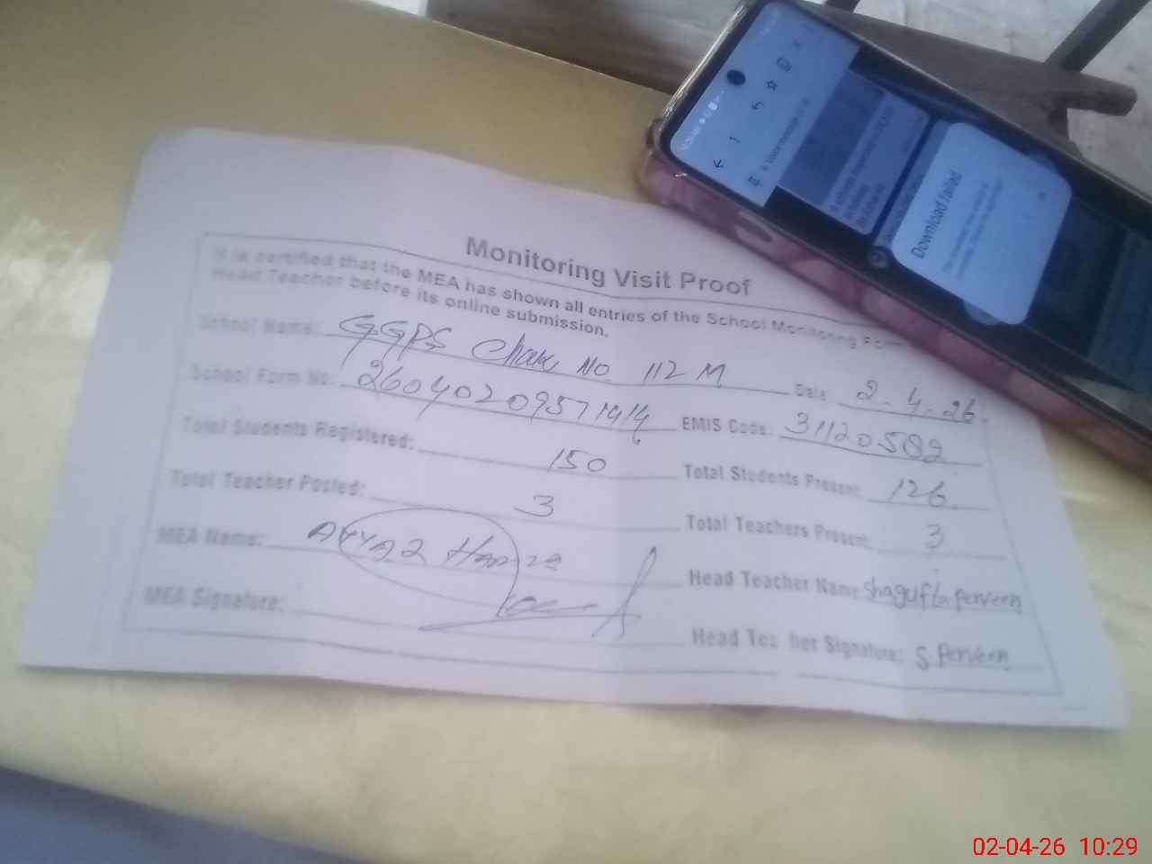 | Attendance Register | Head Teacher | MEA with School | Visit Proof |