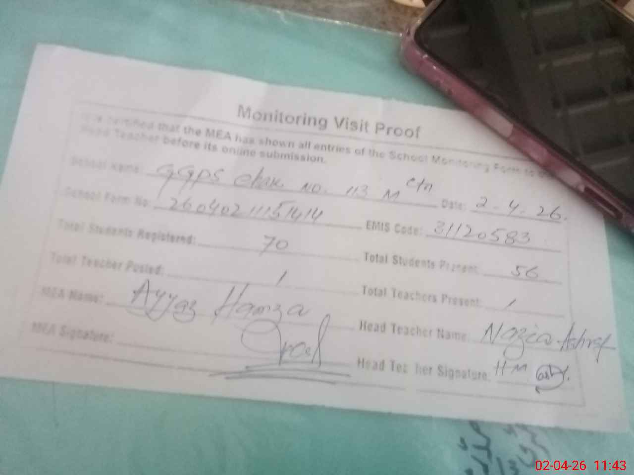 | Attendance Register | Head Teacher | MEA with School | Visit Proof |