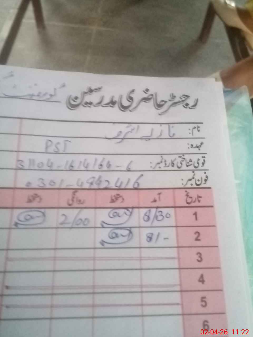 | CNIC | Full Name | Designation | R/C | Absence During Last Calender Month |