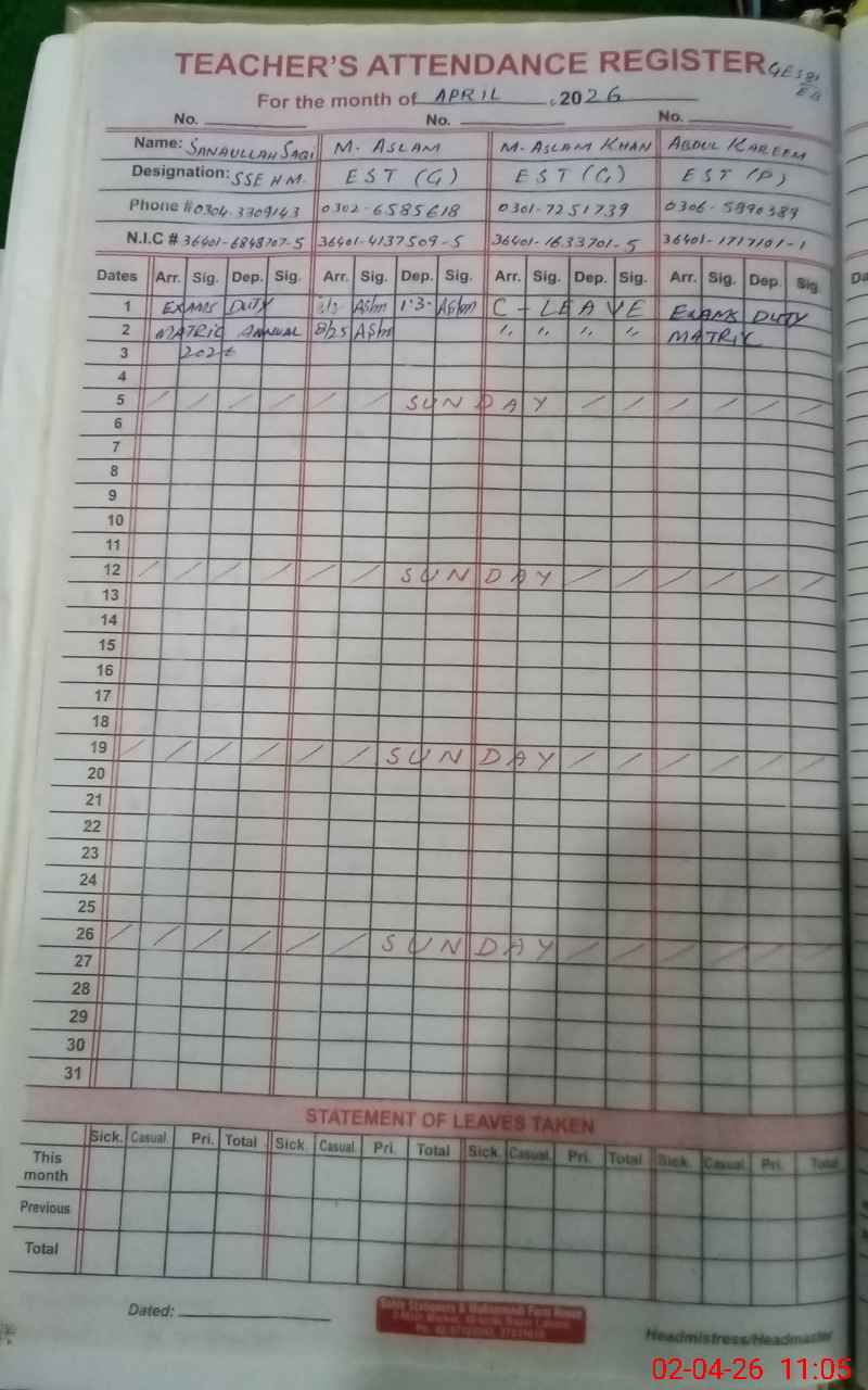 | 36**** | Sa**** Ul**** Sa**** | SSE Science | Contract | 0 | 0 | 0 | 0 | 0 | 0 | 0 | 0 | 0 | Exam Duty |