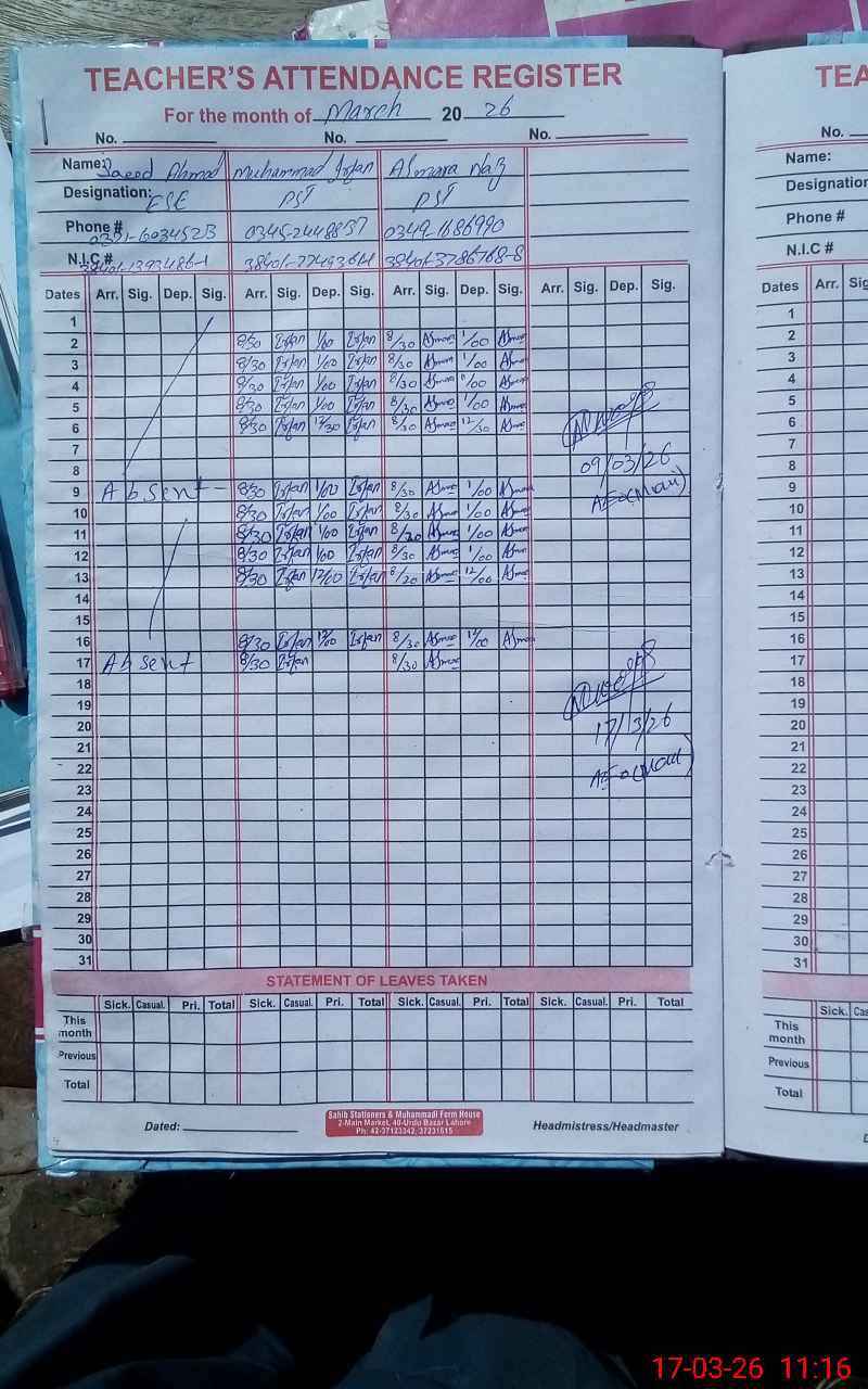 | 38**** | Sa**** Ah**** | ESE (Arts) | Contract | 0 | 0 | 0 | 0 | 0 | 0 | 0 | 0 | 0 | Absent (Un-Authorized) |