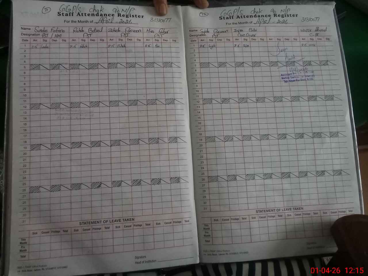 | CNIC | Full Name | Designation | R/C | Absence During Last Calender Month |