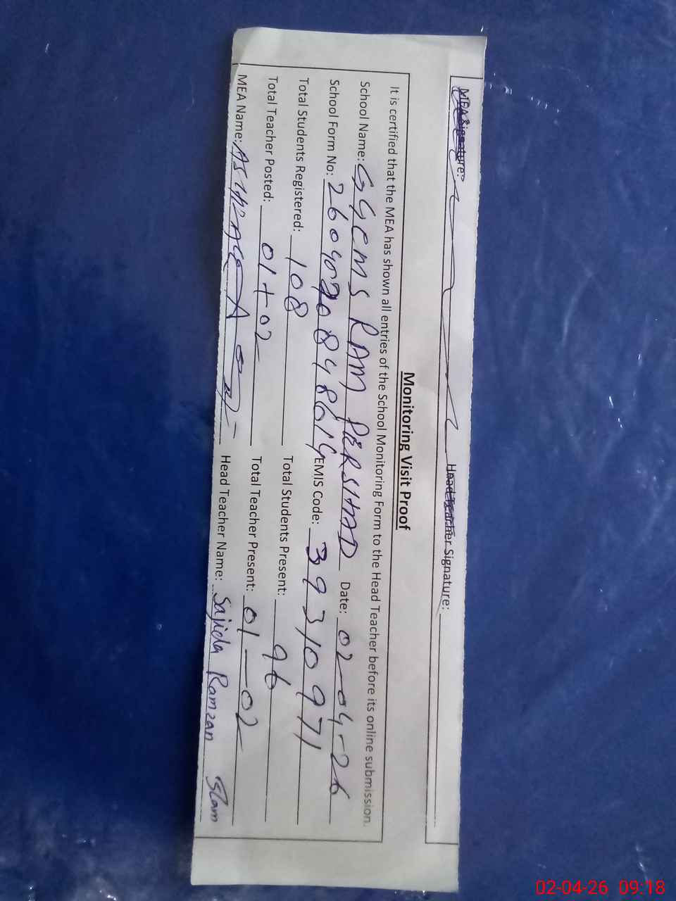 | Attendance Register | Head Teacher | MEA with School | Visit Proof |