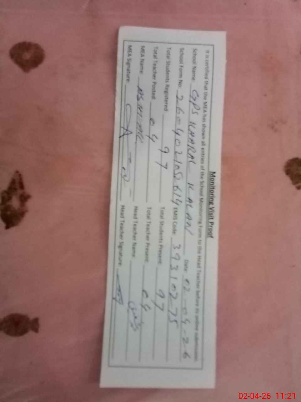 | Attendance Register | Head Teacher | MEA with School | Visit Proof |