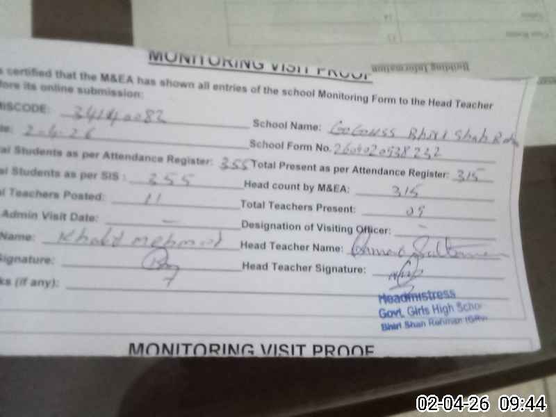| Name: Qa**** Su**** Designation: (School Headmaster's/Headmistress's) SST Phone/Cell Number: 03**** |