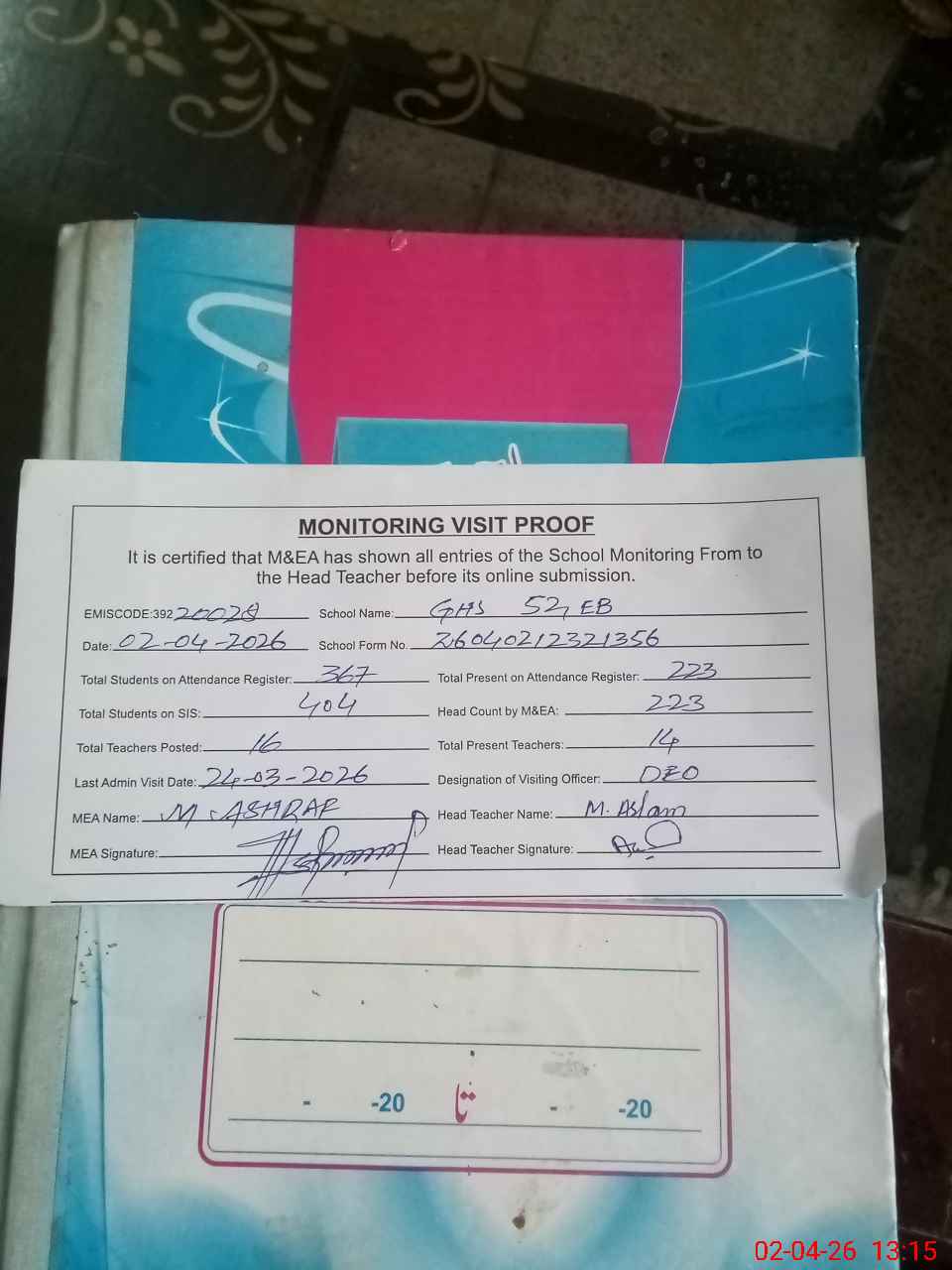 | EMIS Code: 39220028 | Name of School: GHS 52 EB | |||