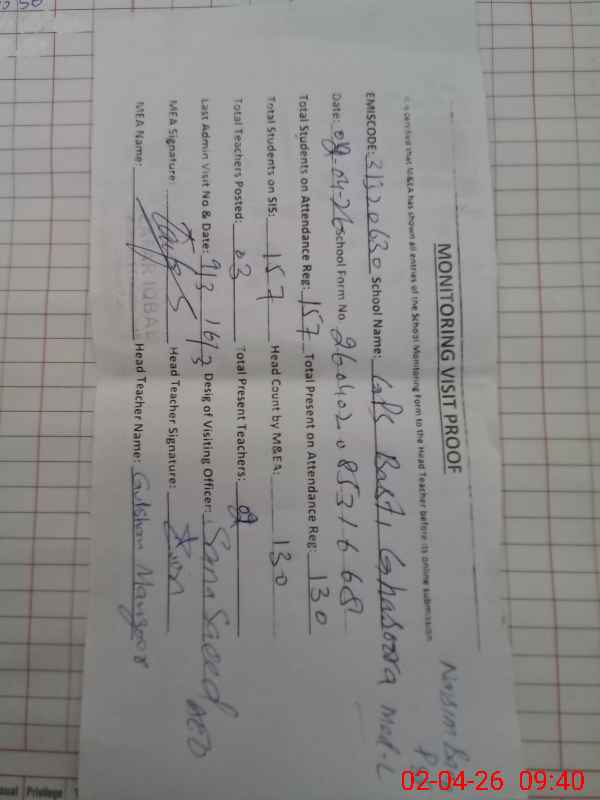 | Certified that this School was Inspected by the Undersigned MEA/DMO Today and the Information Stated Above is as Per Record. | |||||