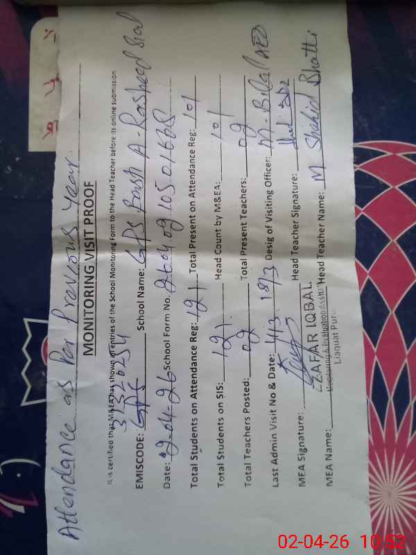 | EMIS Code: 31320254 | Name of School: GPS BASTI ABDUL RASHEED SIAL | |||