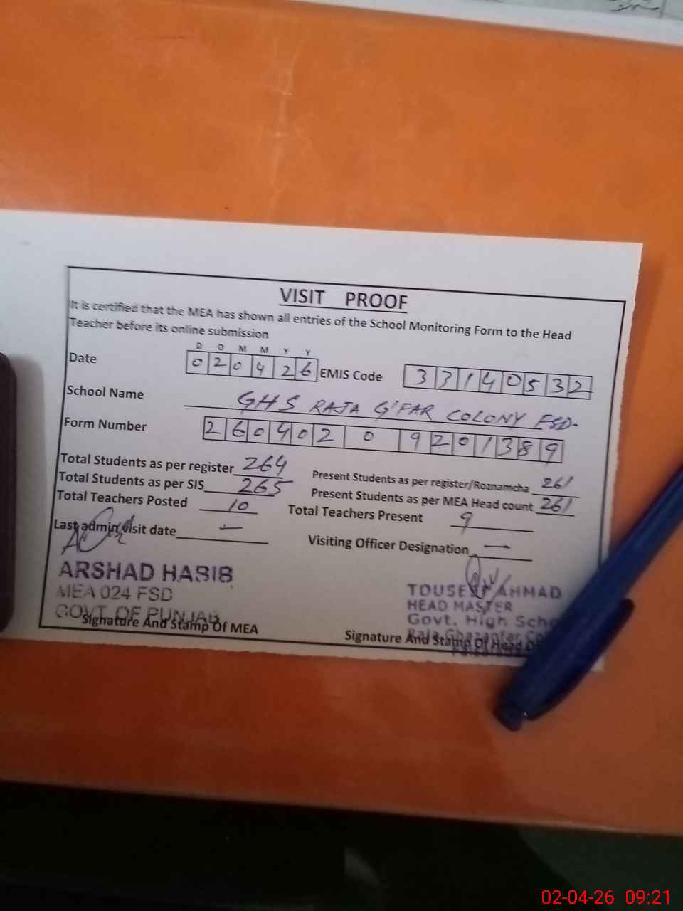 | Attendance Register | Head Teacher | MEA with School | Visit Proof |