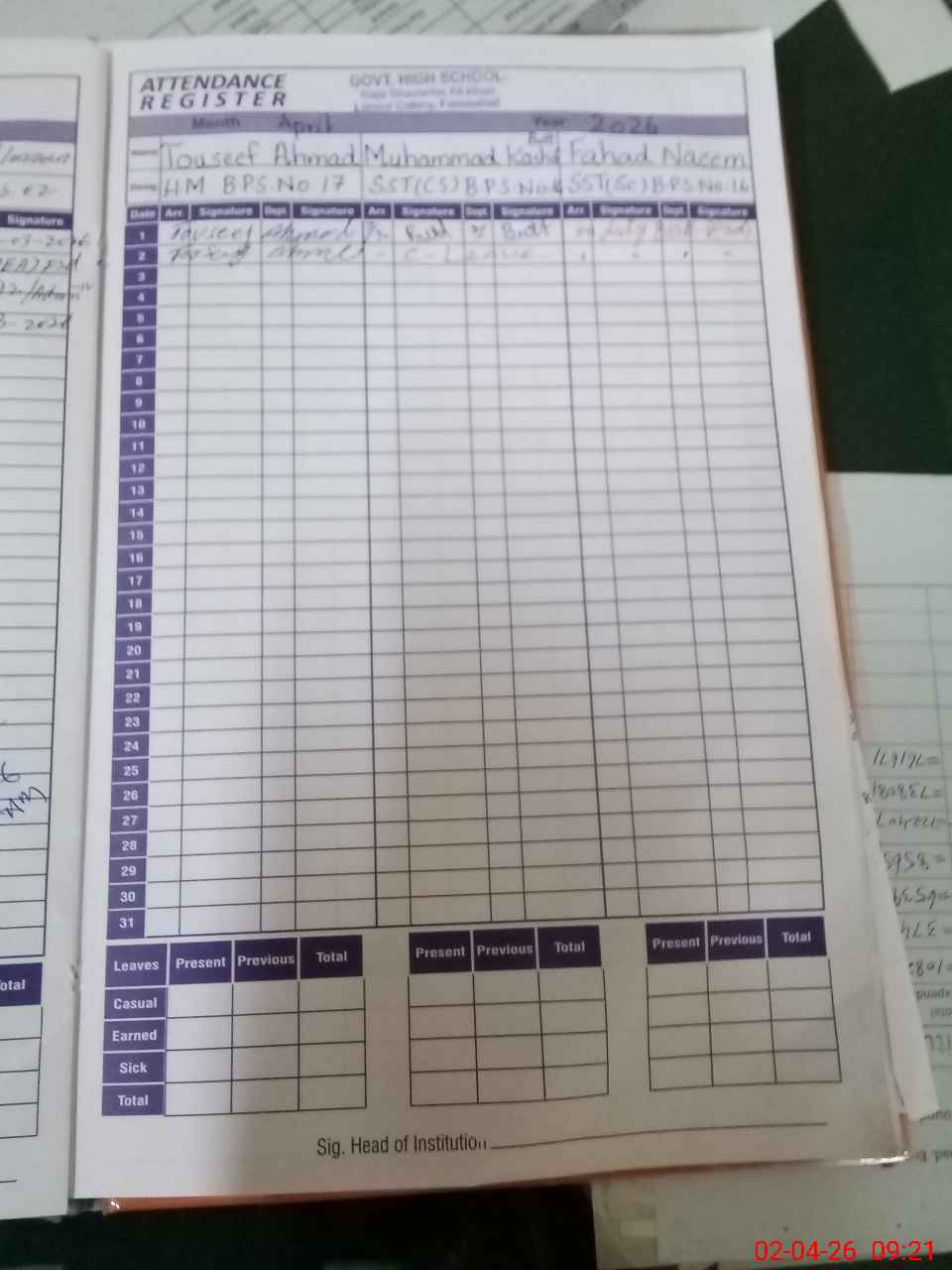| CNIC | Full Name | Designation | R/C | Absence During Last Calender Month |