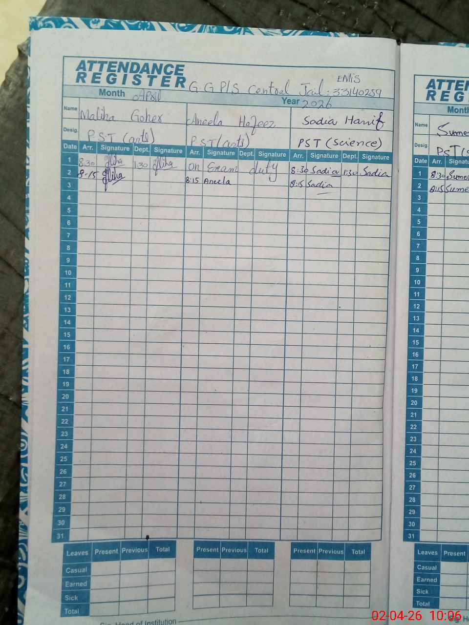 | Leave | Duty | Absent | Maternity | Medical | Ex- Pak |