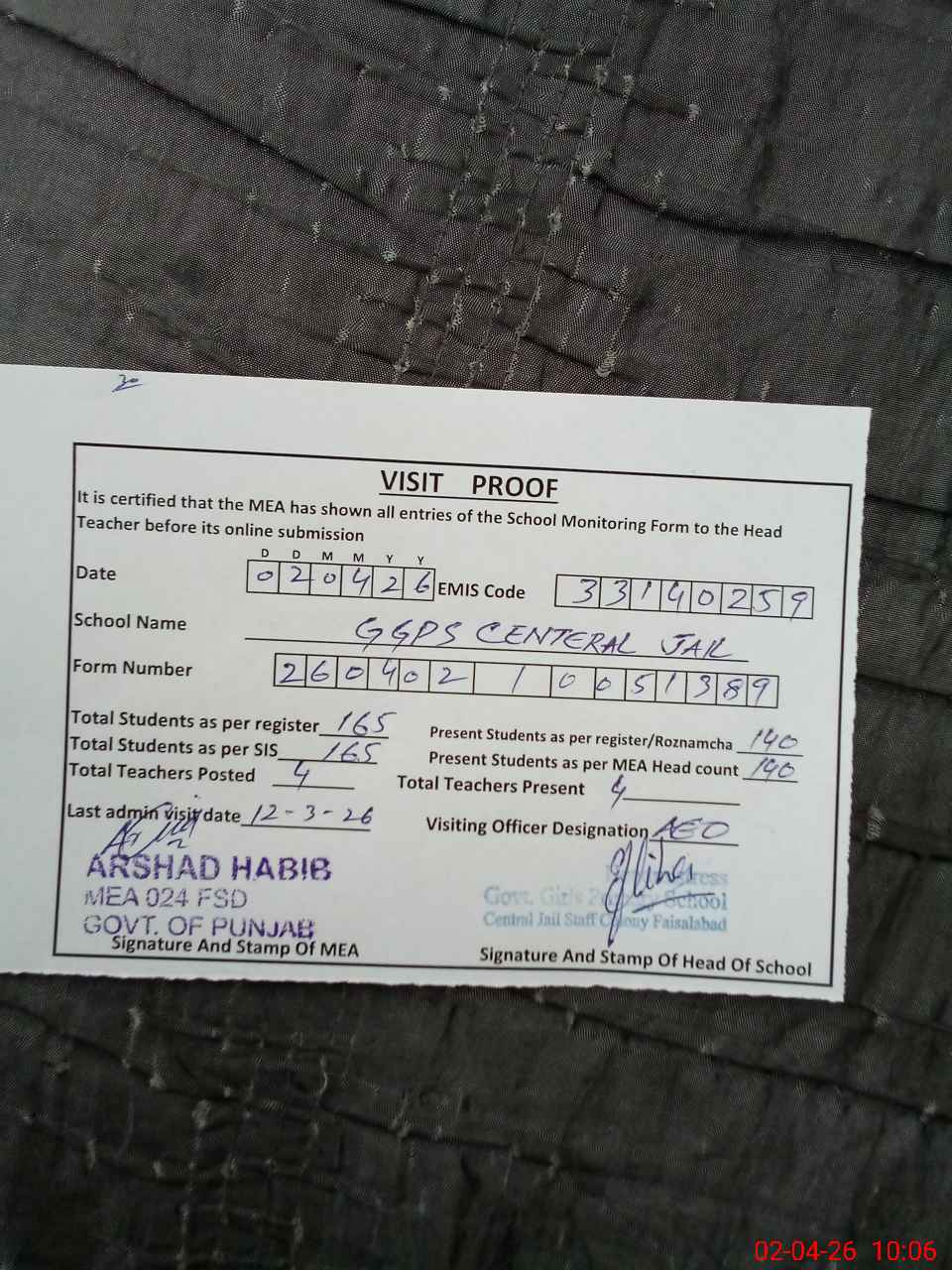 | Certified that this School was Inspected by the Undersigned MEA/DMO Today and the Information Stated Above is as Per Record. | |||||