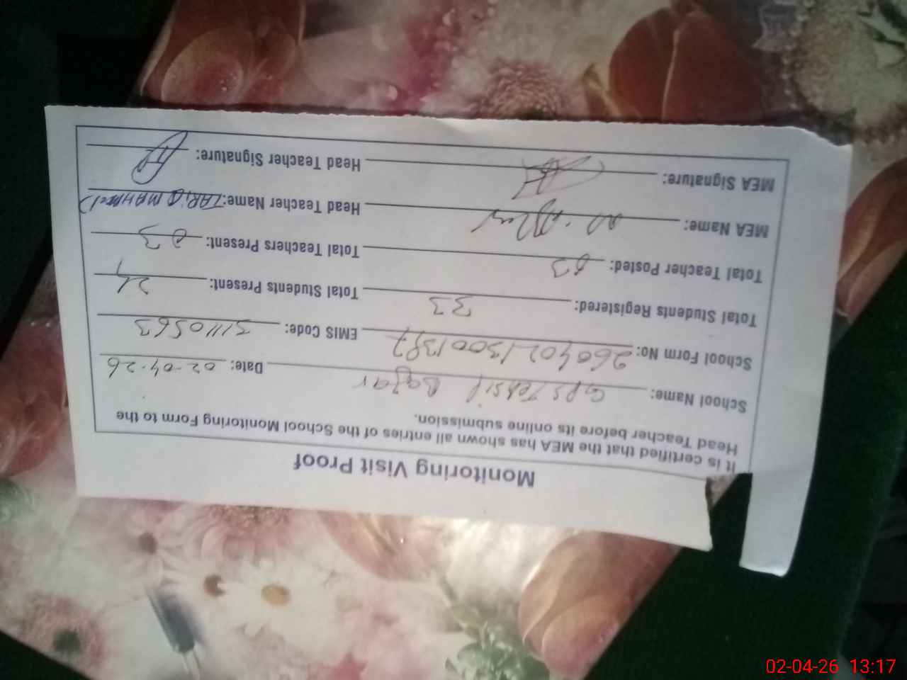 | Attendance Register | Head Teacher | MEA with School | Visit Proof |