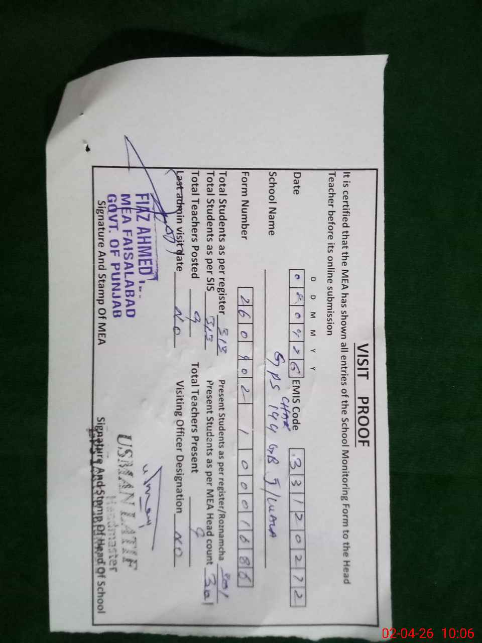 | Certified that this School was Inspected by the Undersigned MEA/DMO Today and the Information Stated Above is as Per Record. | |||||
