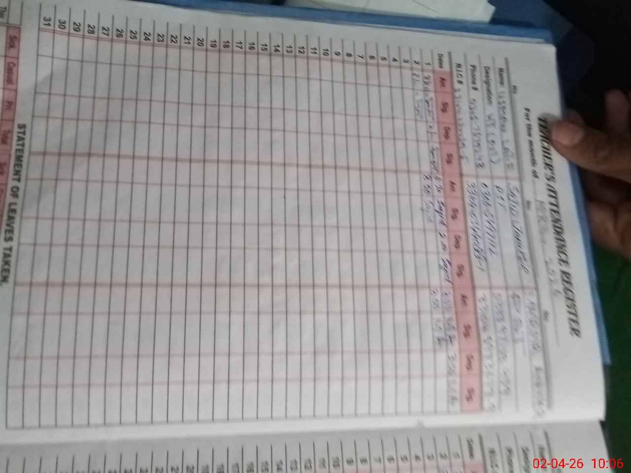 | CNIC | Full Name | Designation | R/C | Absence During Last Calender Month |
