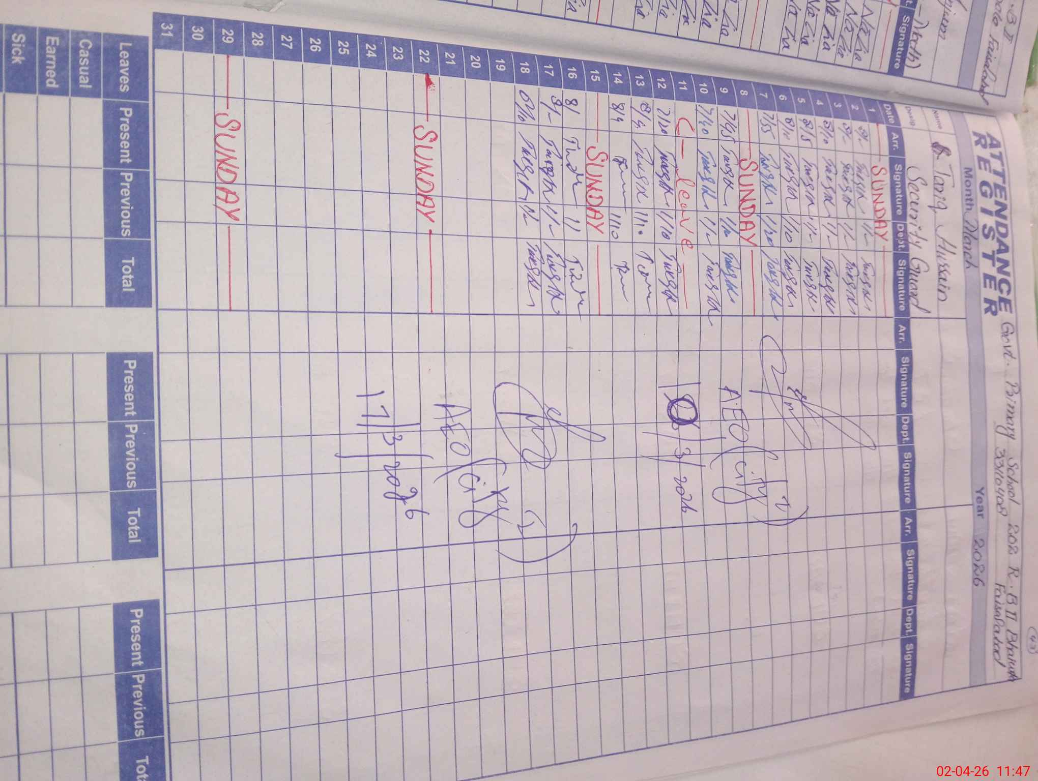 | CNIC | Full Name | Designation | R/C | Absence During Last Calender Month |