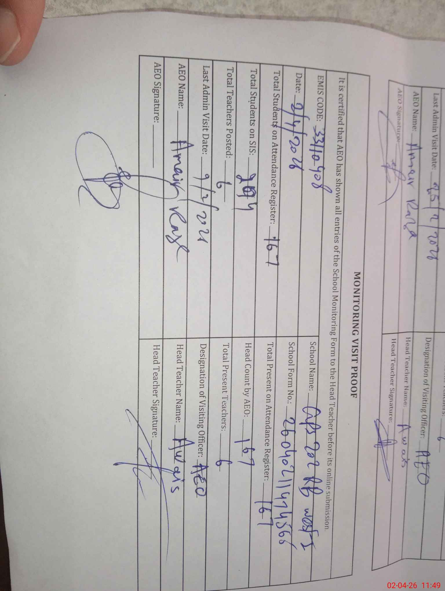 | Attendance Register | Head Teacher | MEA with School | Visit Proof |