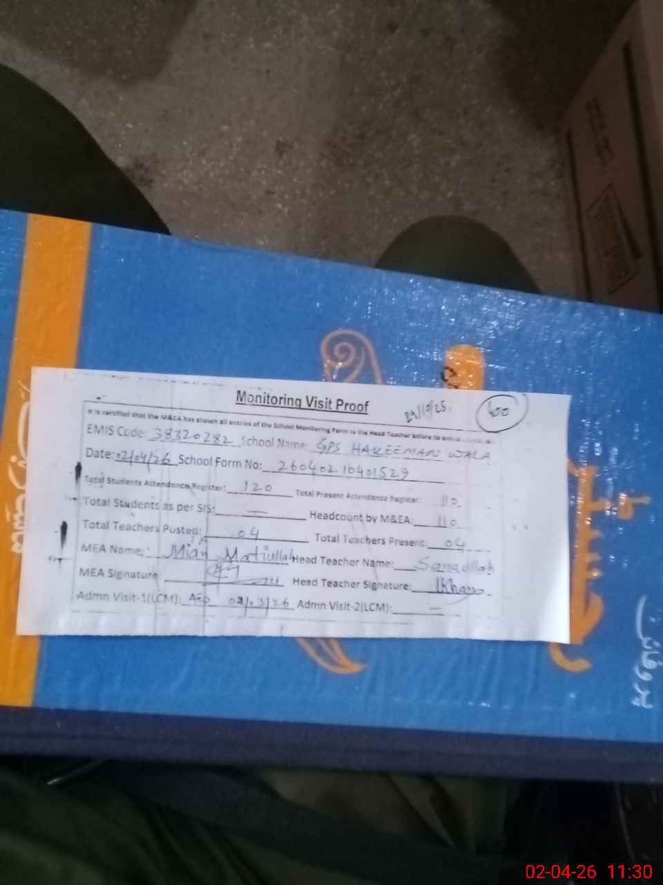 | EMIS Code: 38320282 | Name of School: GPS HAKEEMAN WALA | |||