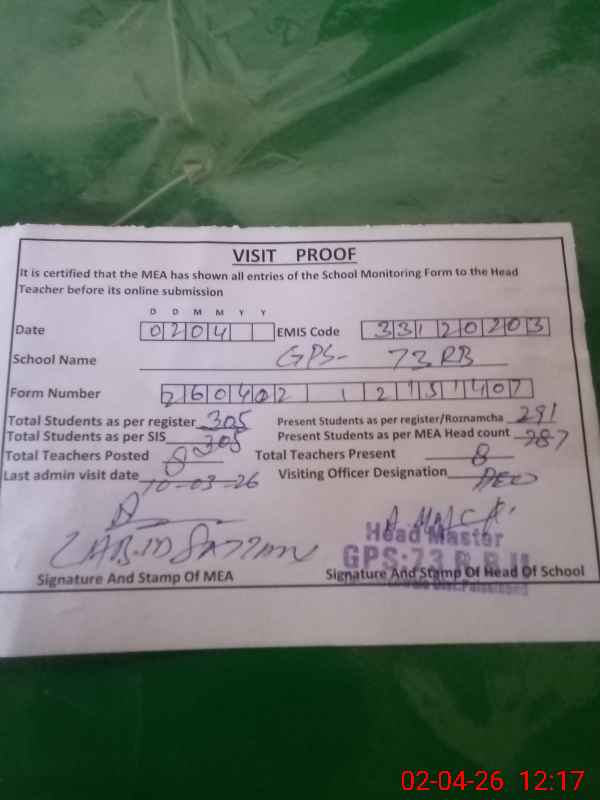 | EMIS Code: 33120203 | Name of School: GPS CHAK 73 RB II | |||