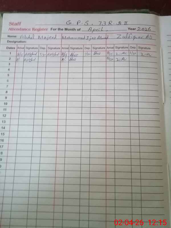 | CNIC | Full Name | Designation | R/C | Absence During Last Calender Month |