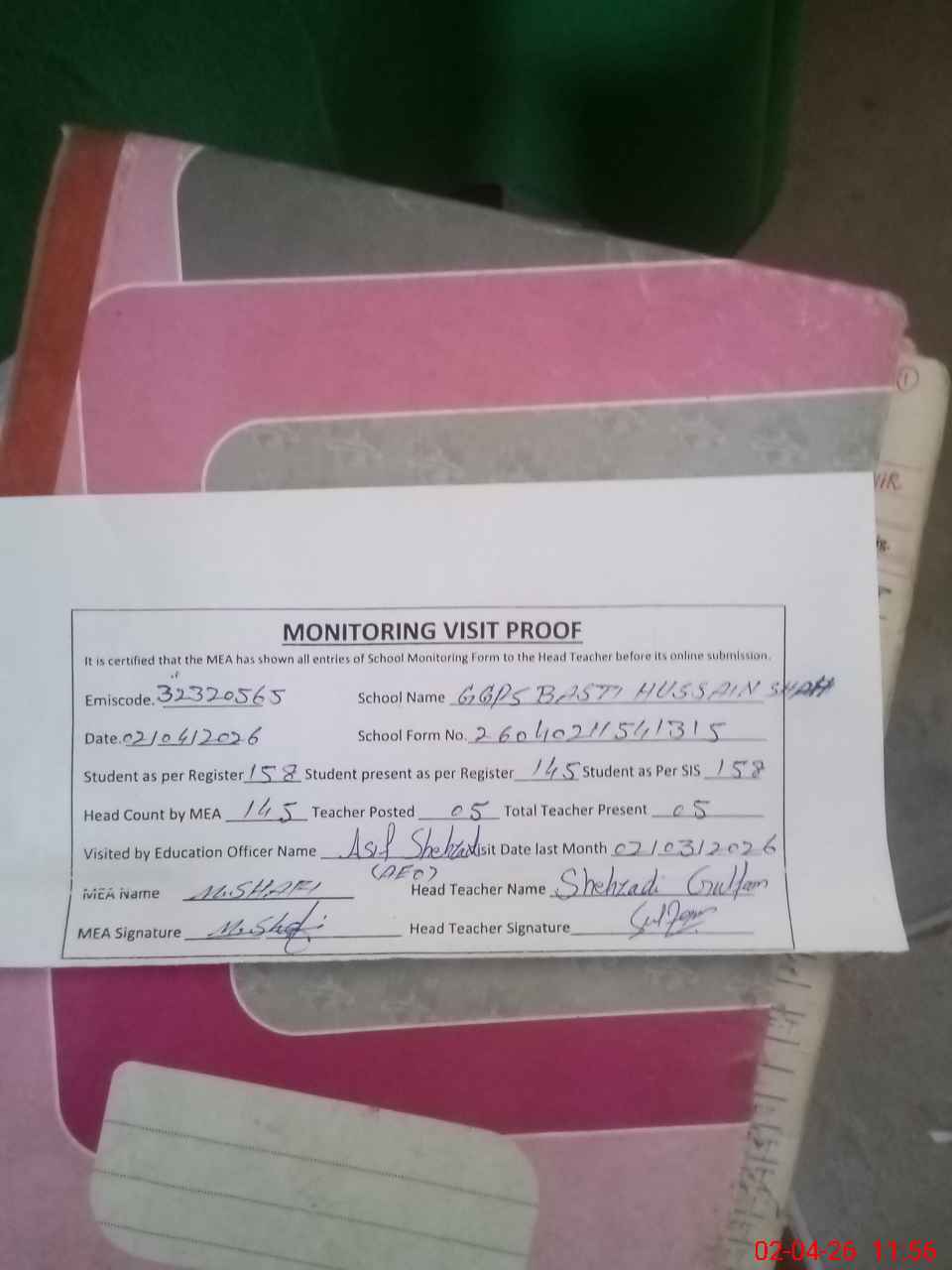 | Attendance Register | Head Teacher | MEA with School | Visit Proof |