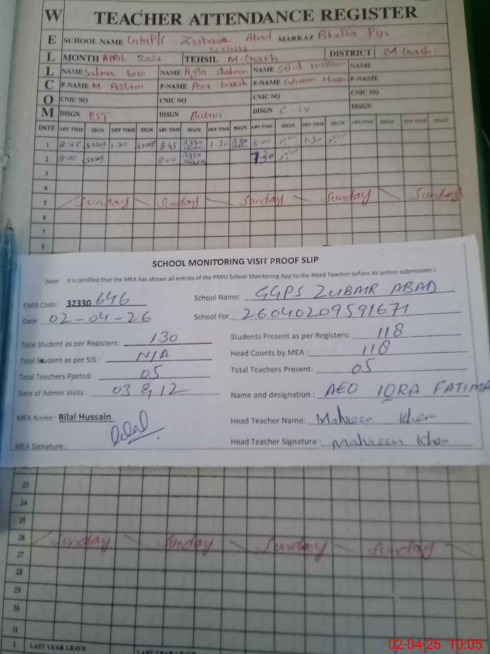 | Attendance Register | Head Teacher | MEA with School | Visit Proof |