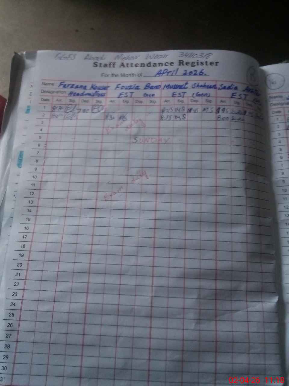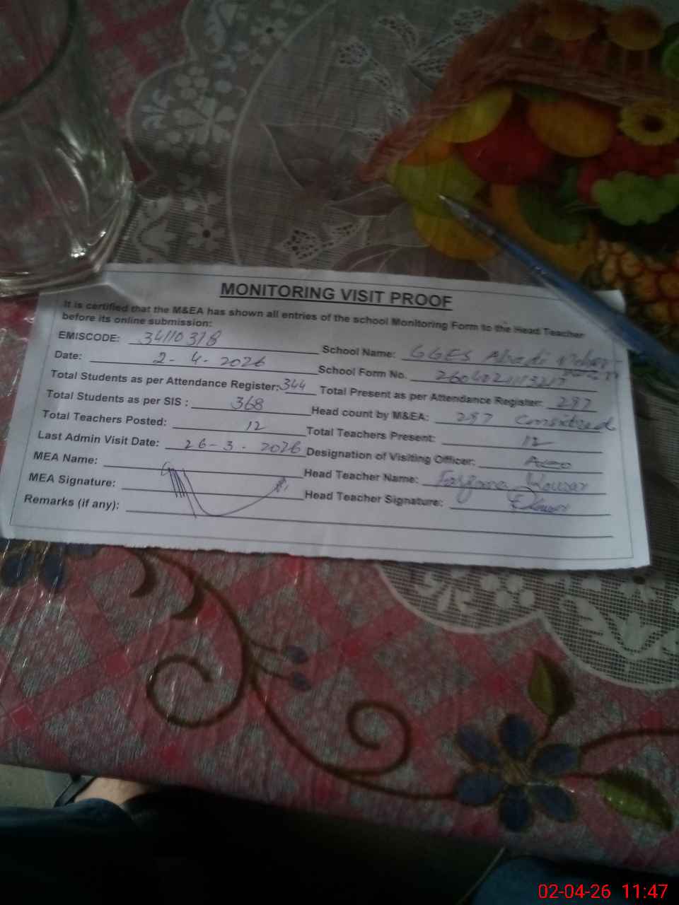 | Attendance Register | Head Teacher | MEA with School | Visit Proof |
