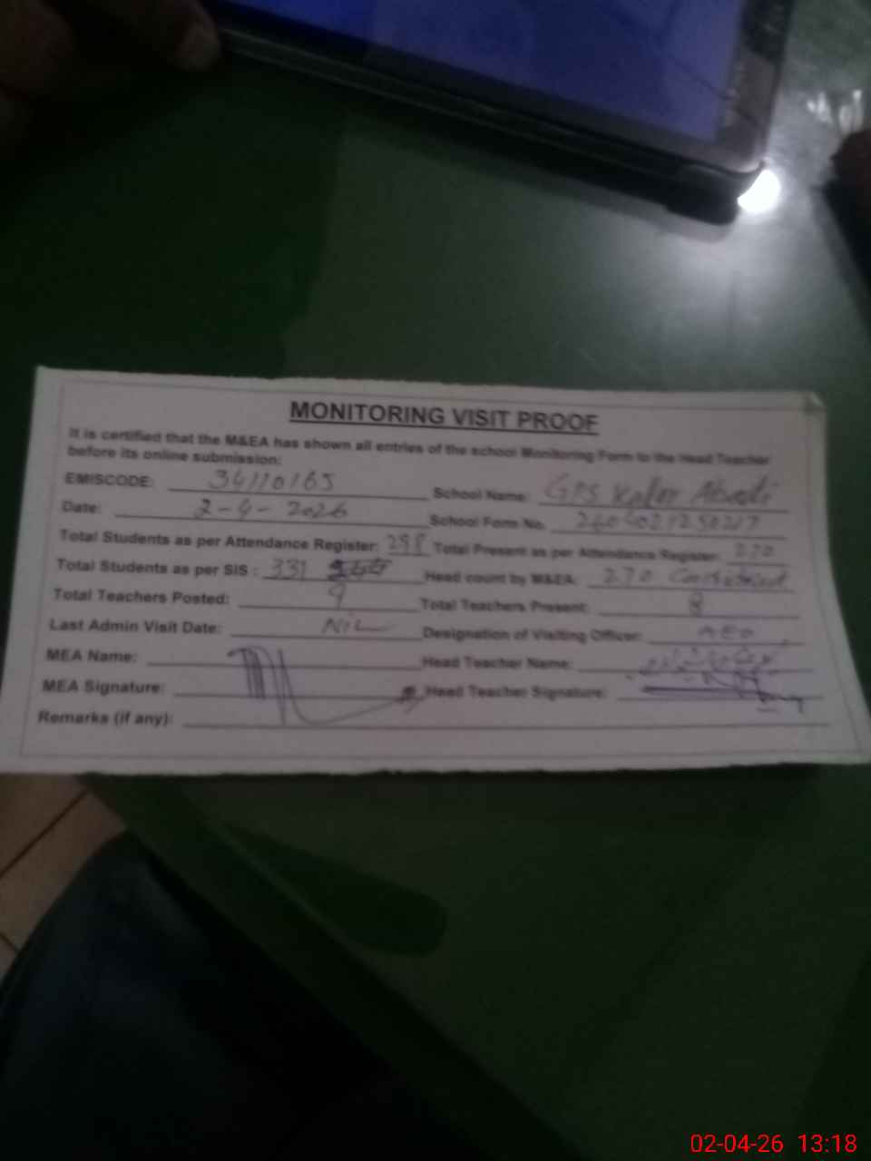 | Attendance Register | Head Teacher | MEA with School | Visit Proof |