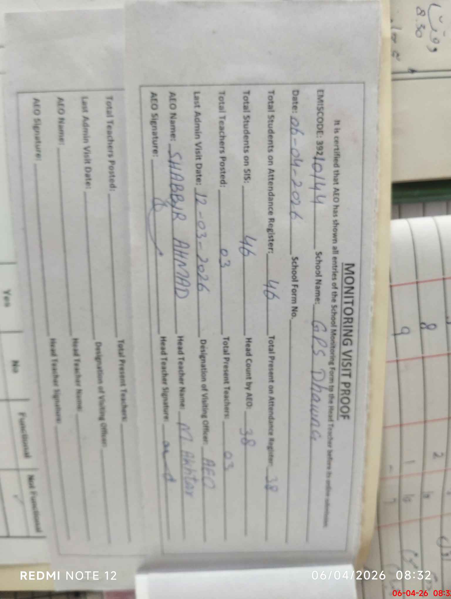 | EMIS Code: 39210144 | Name of School: GPS DHAWANA | |||