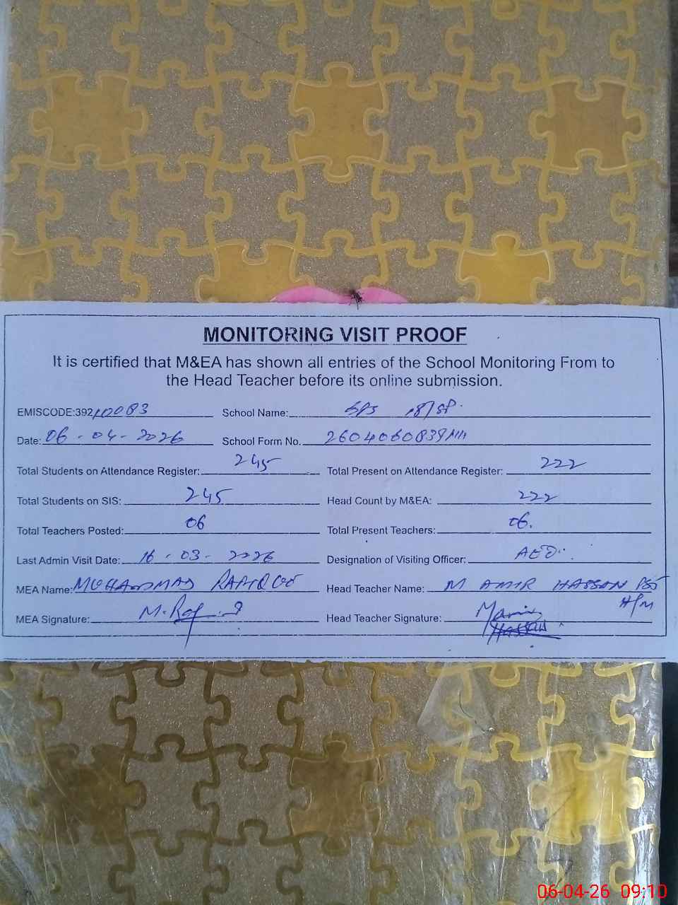 | Certified that this School was Inspected by the Undersigned MEA/DMO Today and the Information Stated Above is as Per Record. | |||||