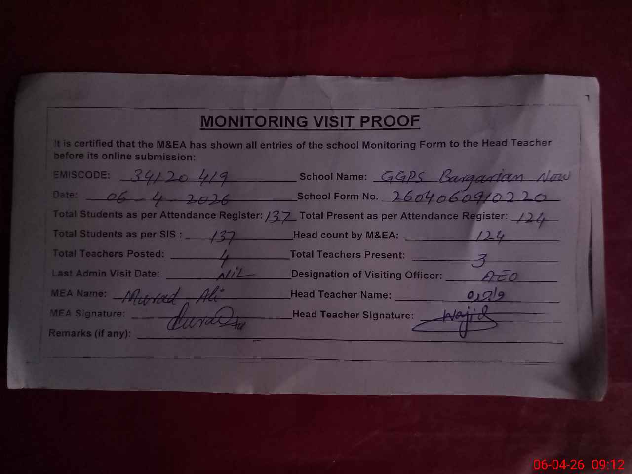 | Attendance Register | Head Teacher | MEA with School | Visit Proof |