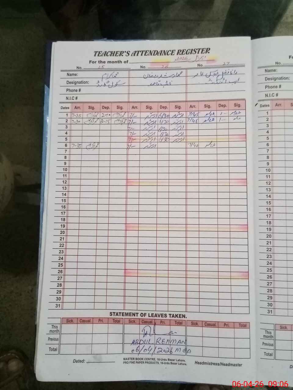 | Total no. of Classrooms: 24 No. of Classrooms Used for Teaching: 19 No. of Classrooms Storing Old Furniture, FTBs, etc: 0Comments if Any: No admin visit since November 2025 EST Mr. Muhammad Roshan CNICN 3830310119537 and Mali Abdul Satar CNICN 3830309785851 both are on LPR SIS not working therefore students enrollment on SIS not updated New classes session is in progress |