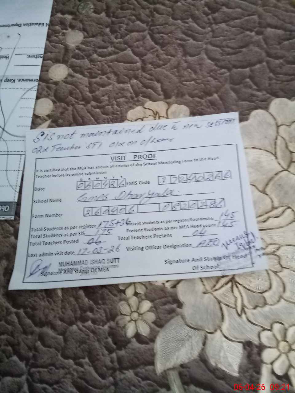 | Certified that this School was Inspected by the Undersigned MEA/DMO Today and the Information Stated Above is as Per Record. | |||||