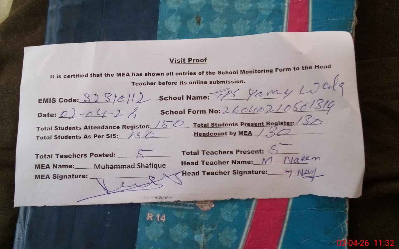 | Attendance Register | Head Teacher | MEA with School | Visit Proof |